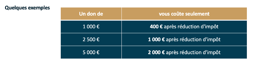 Qui plus est, votre générosité est récompensée par une réduction d'impôt conséquente. La réduction d'impôt est égale à 60% du montant de votre don (dans la limite de 2 M€). Elle vient en soustraction du montant de l'impôt sur les sociétés (IS) dû l'année du versement.